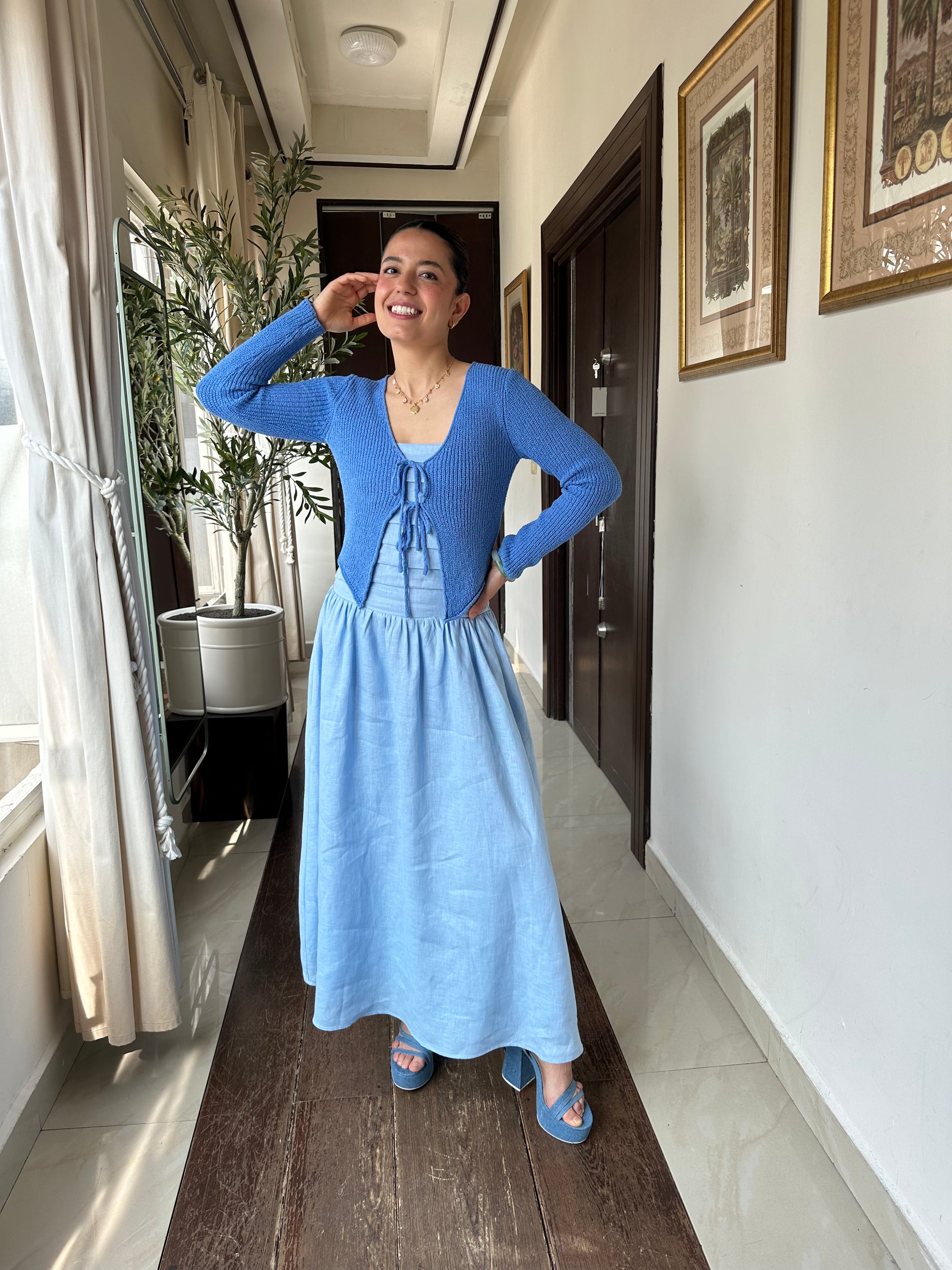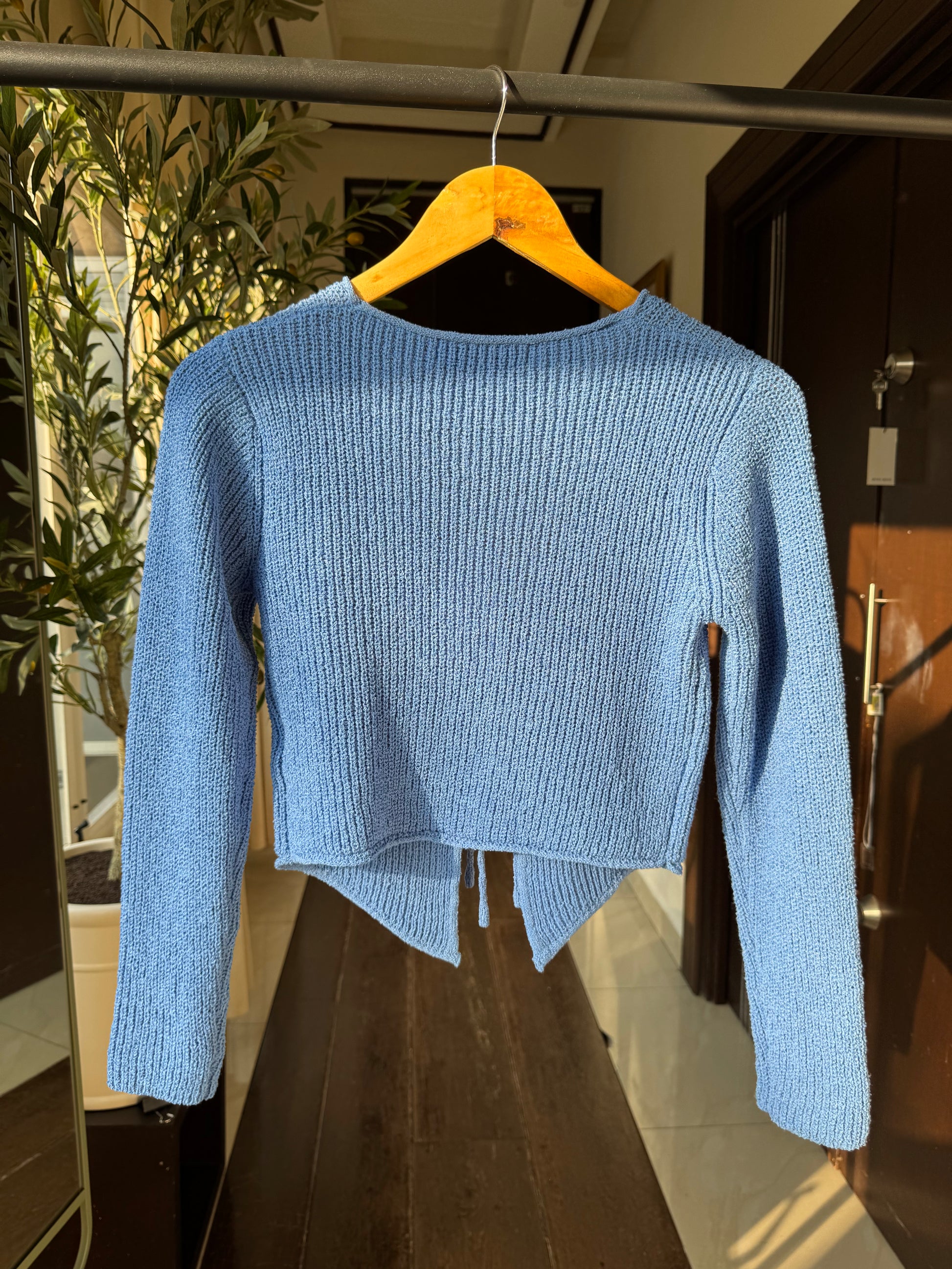 Blusa tipo cardigan tejido con lazos en el frente ajustable.