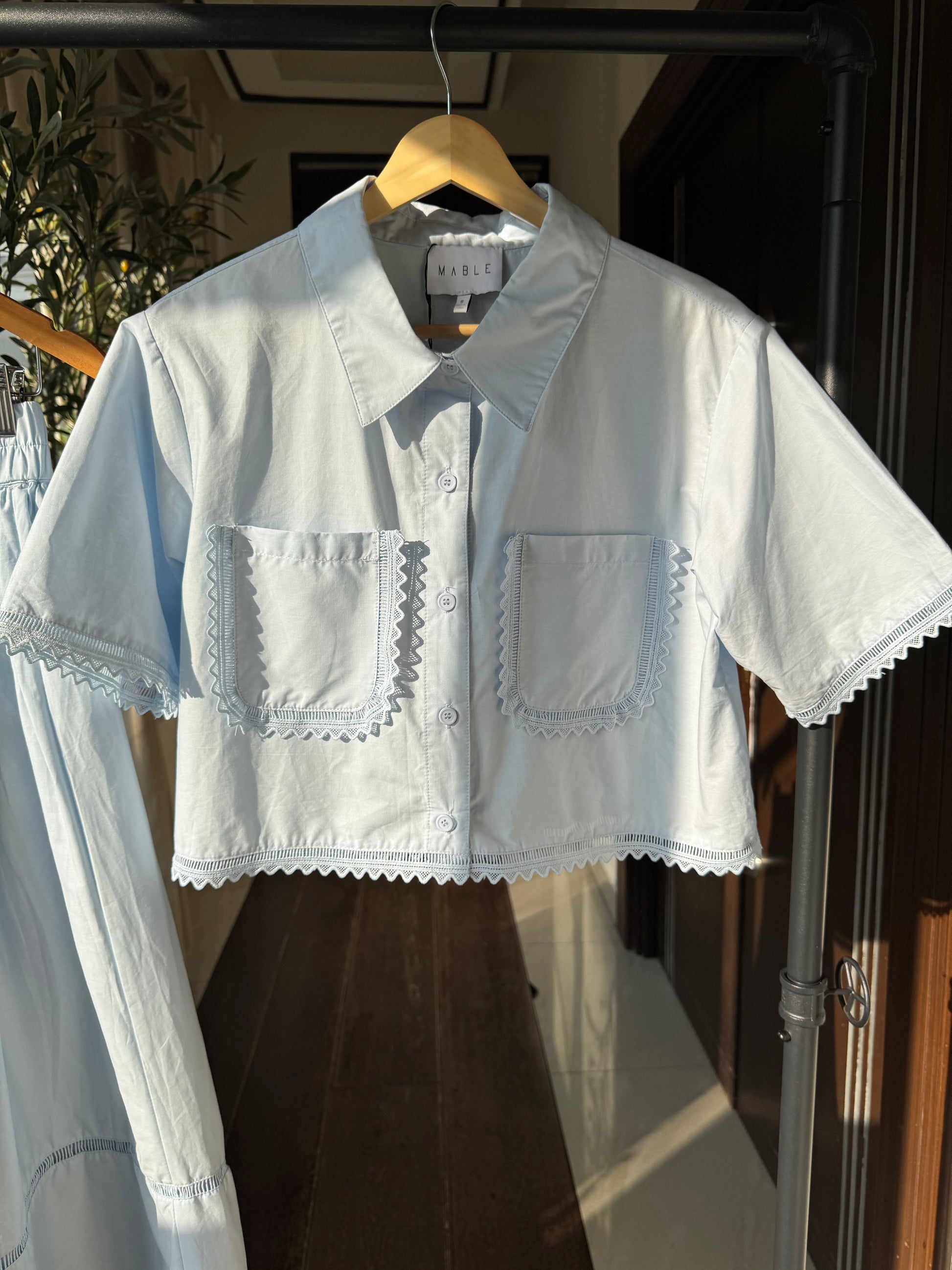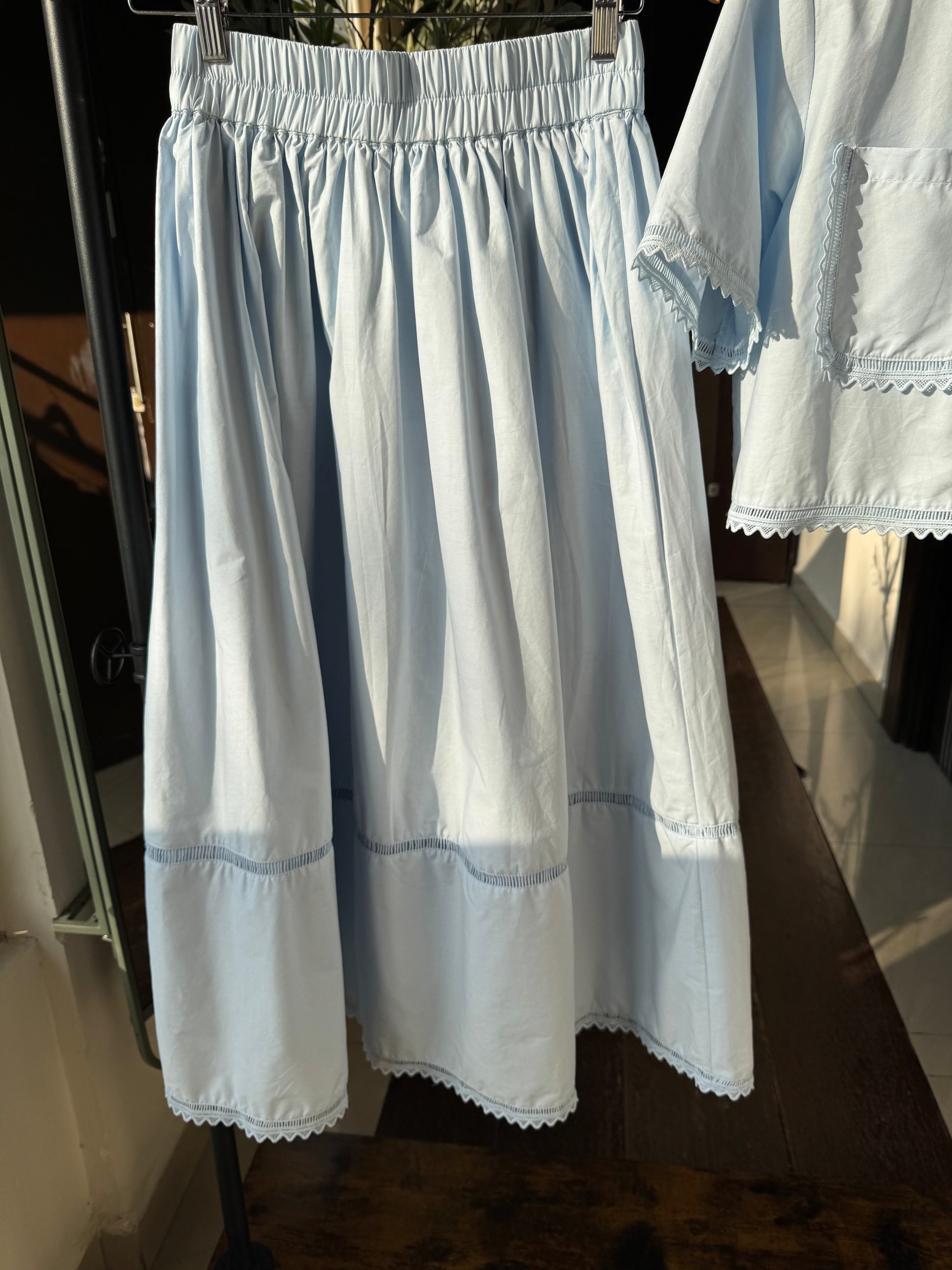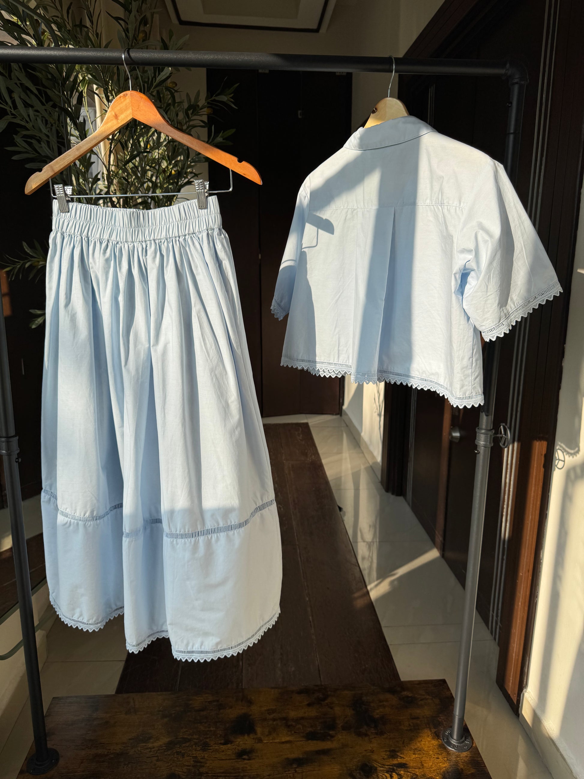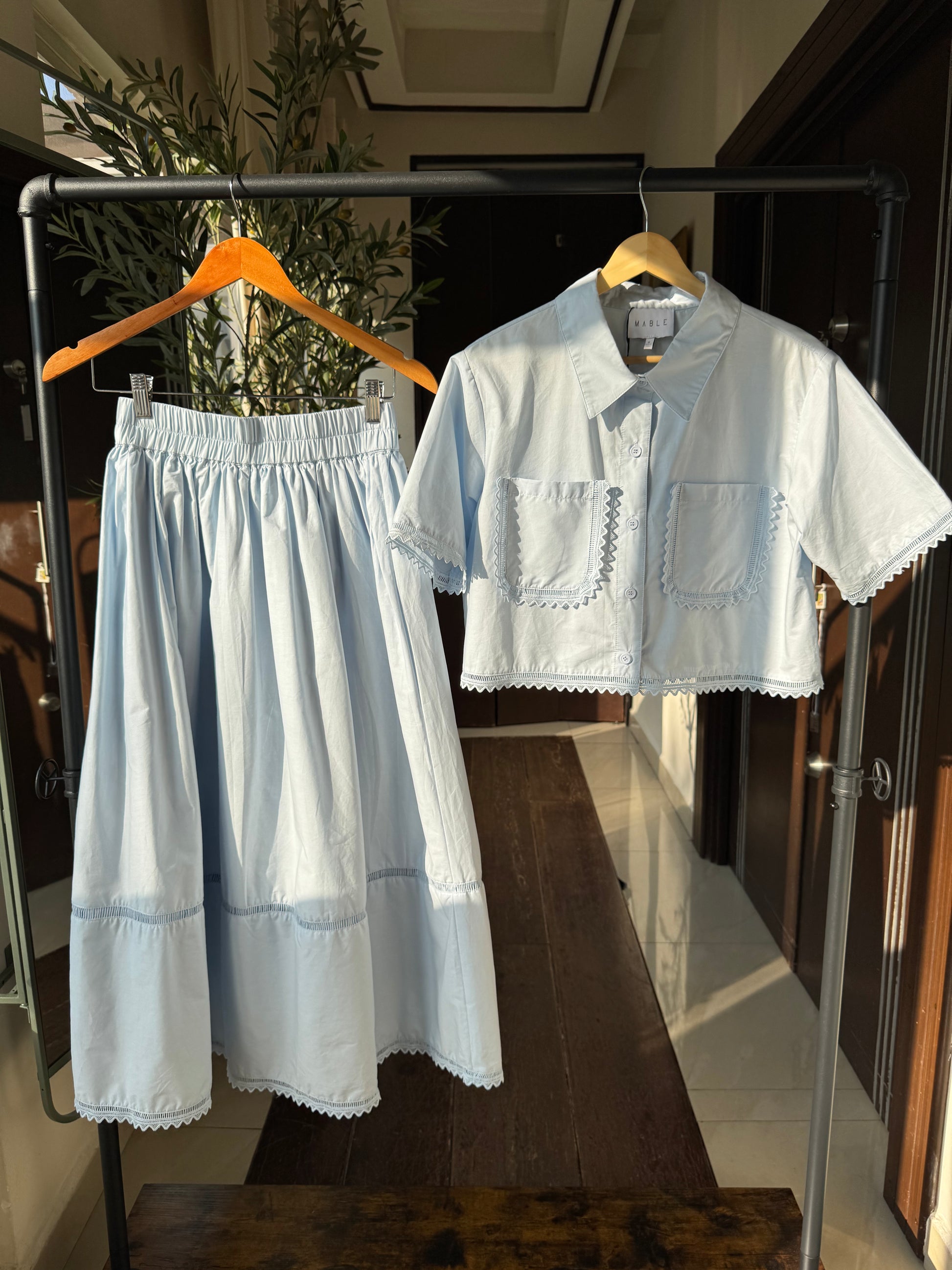 La camisa crop, adornada con detalles de encaje en los bordes y falda midi en color baby blue.