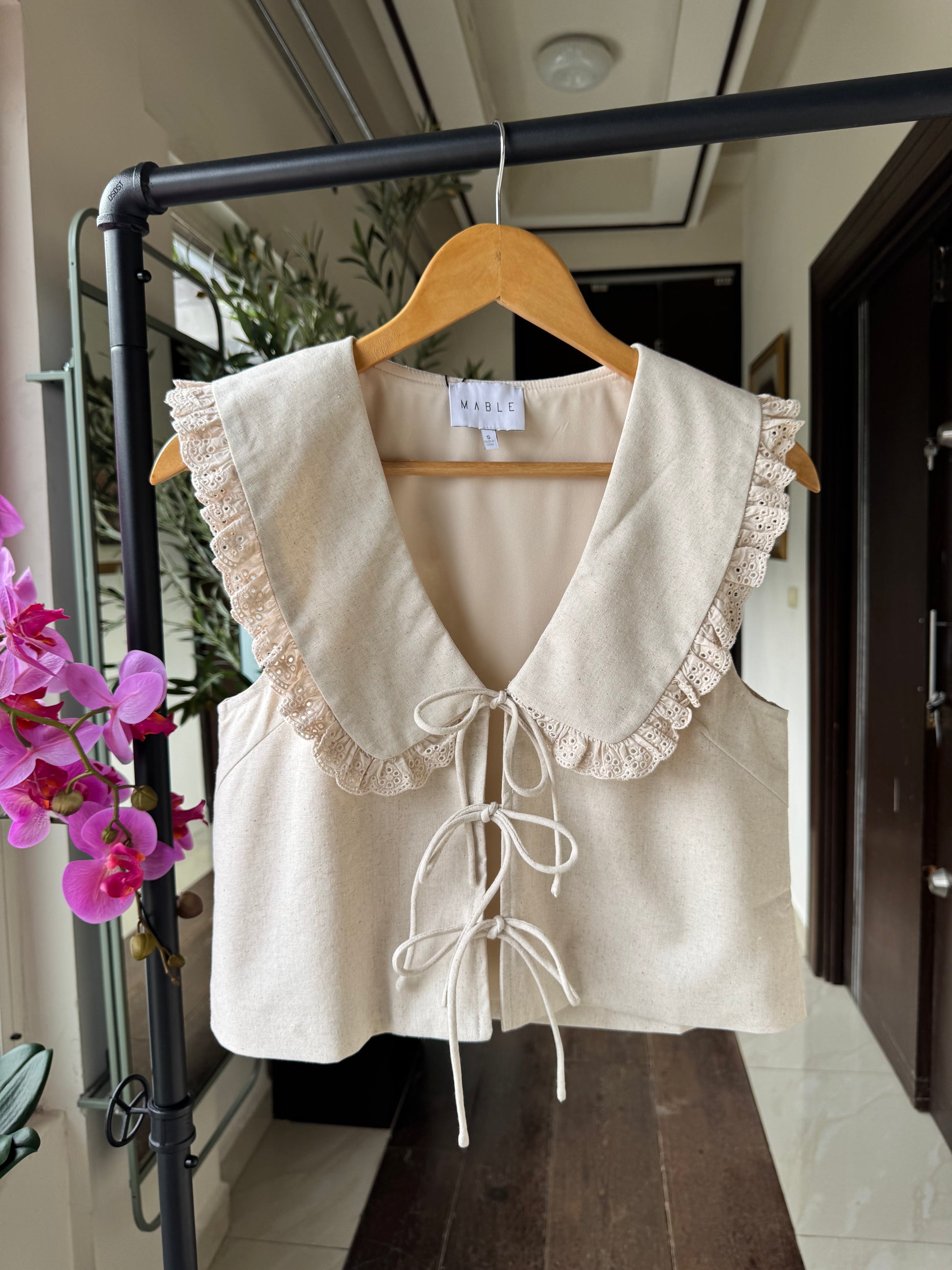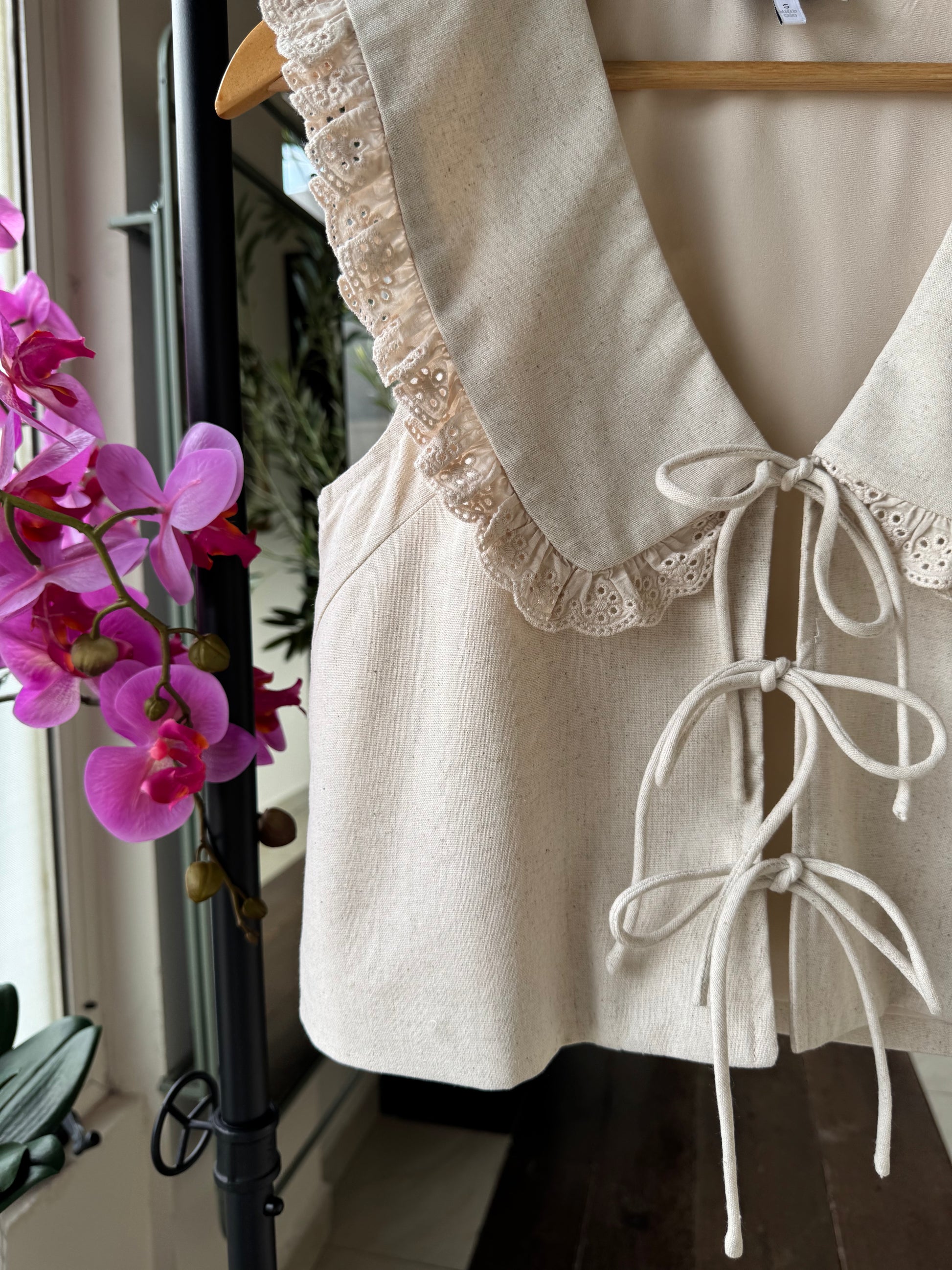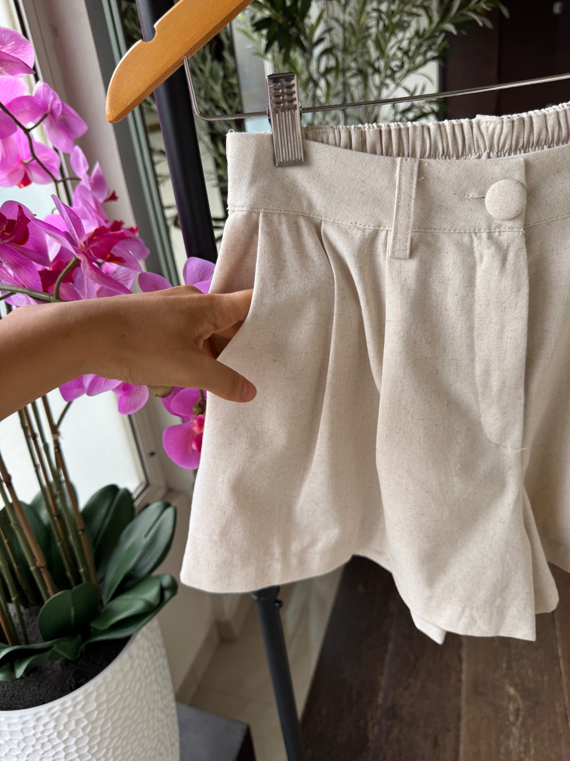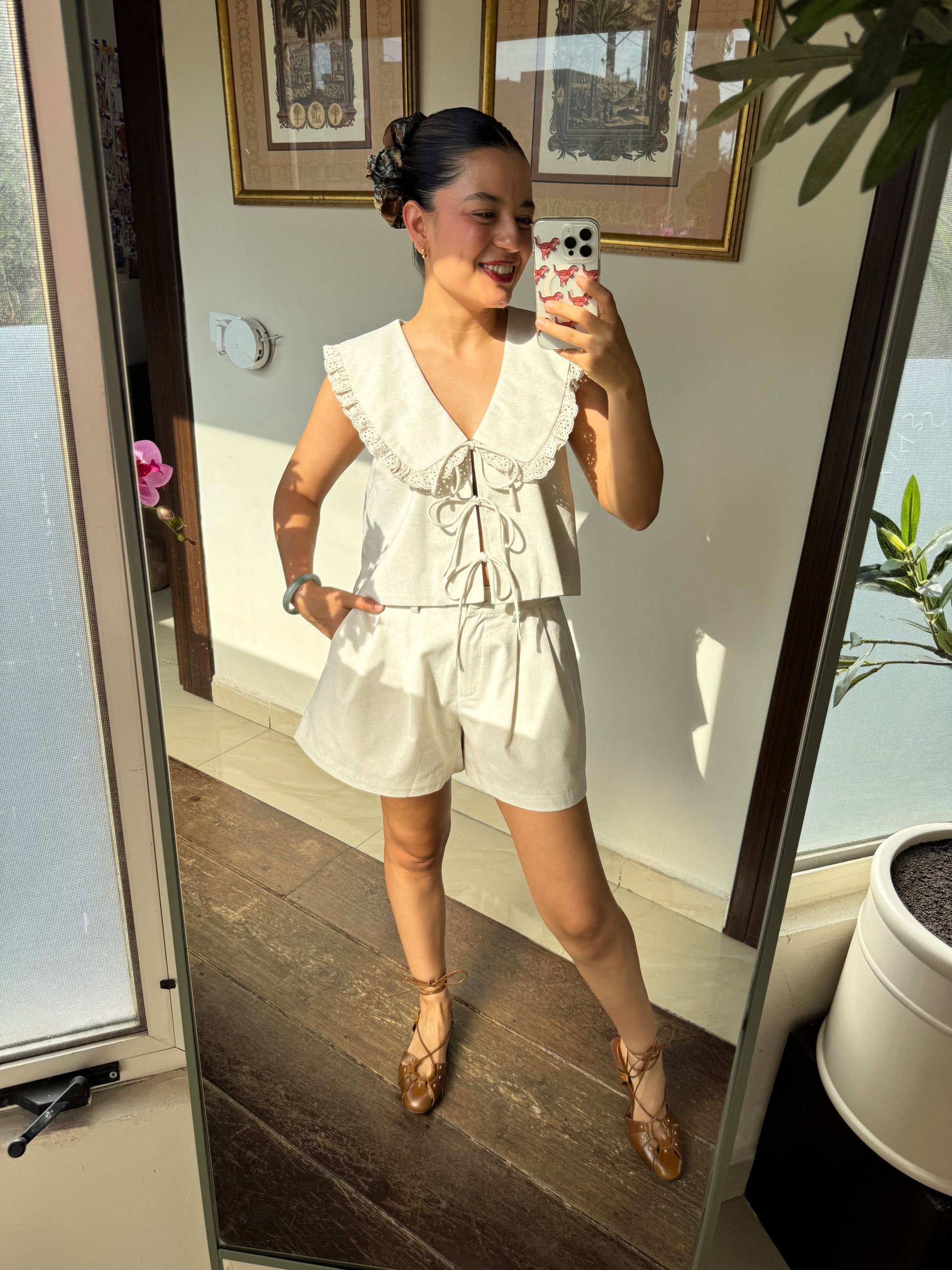 SET DE LINO, SHORT CON RESORTE Y BLUSA CON CUELLO PETER PAN CON CINTAS AJUSTABLES